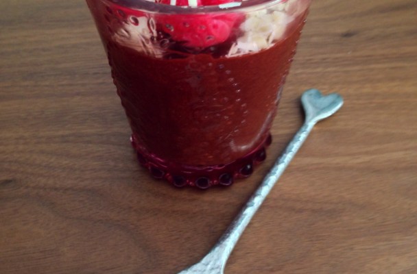- Place in to 4 x glasses or pots of similar size as shown in the picture or 6 smaller pots. Place in the fridge until wanted and top with fruit and chocolate peelings of your choice and enjoy!