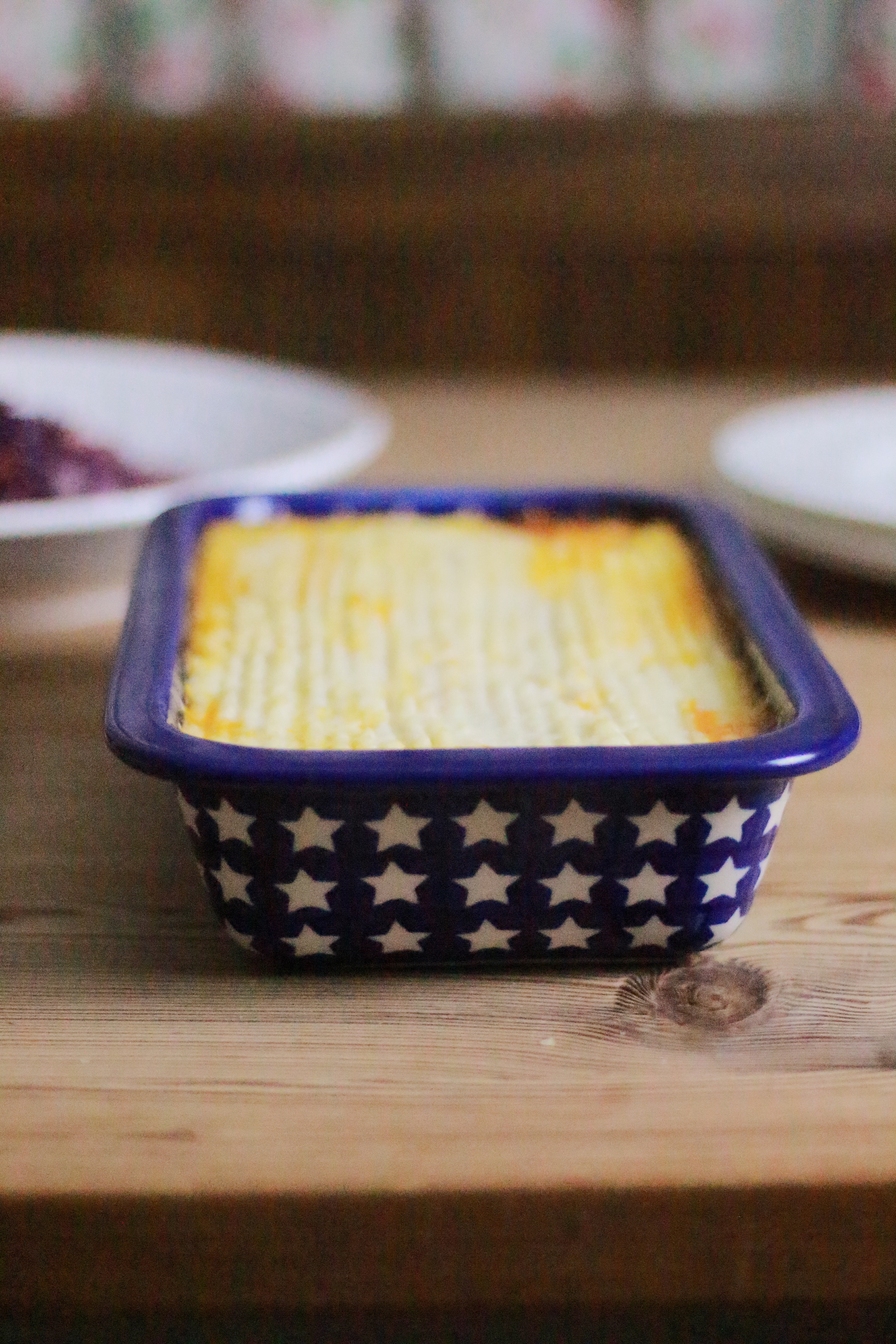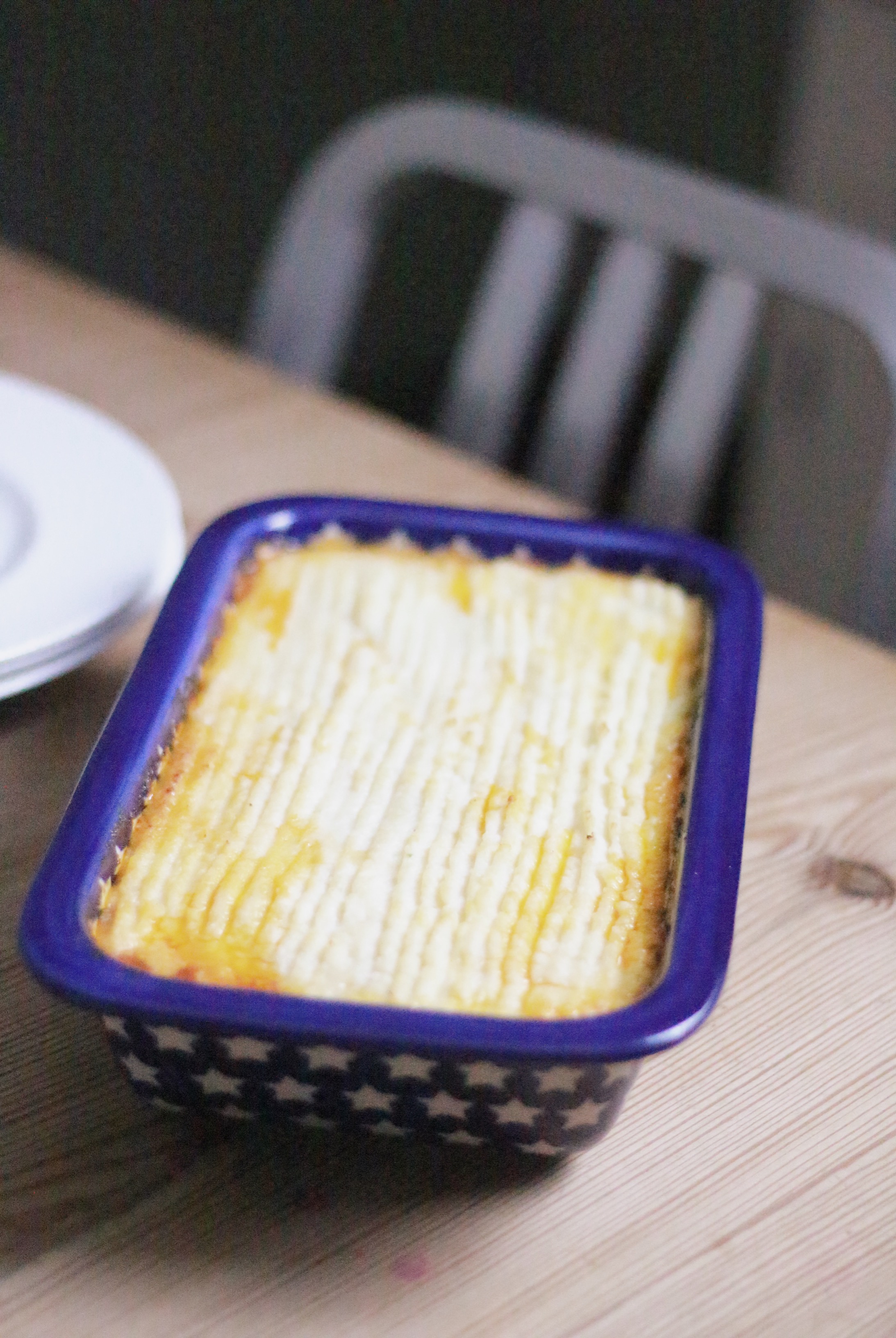 8. Place the mince in an oven proof dish and cover with the cauliflower sauce and place in the pre-heated oven for 25 mins.